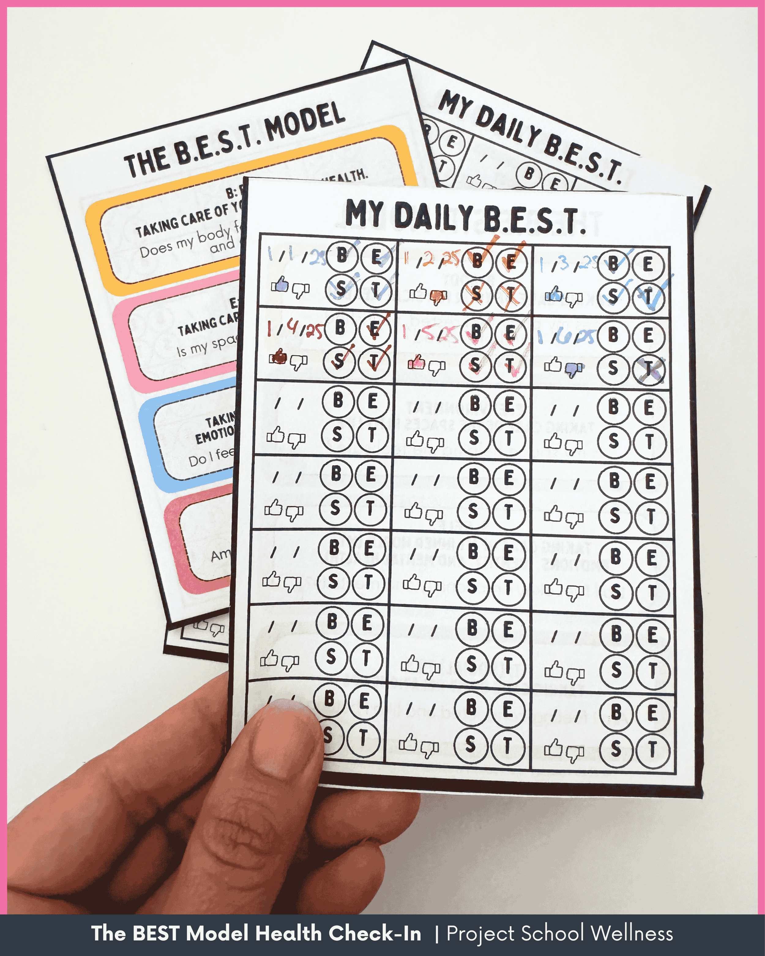 This mini health worksheet is the perfect printable for a health class. Print off a sheet (4x per sheet) and give each student a sheet. Then, they can use they can track their daily BEST as a quick check-in with their well-being.