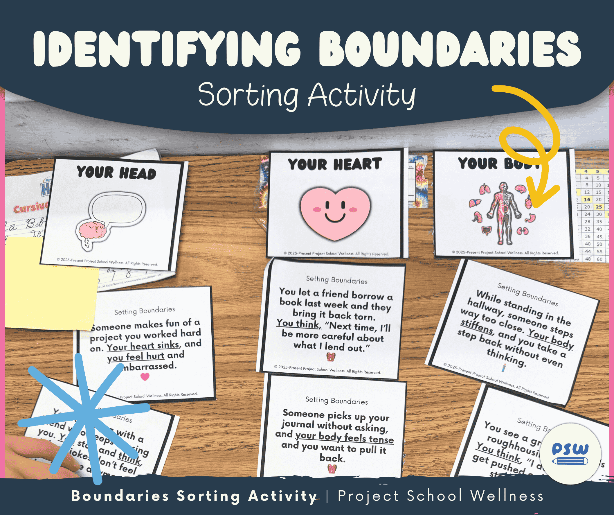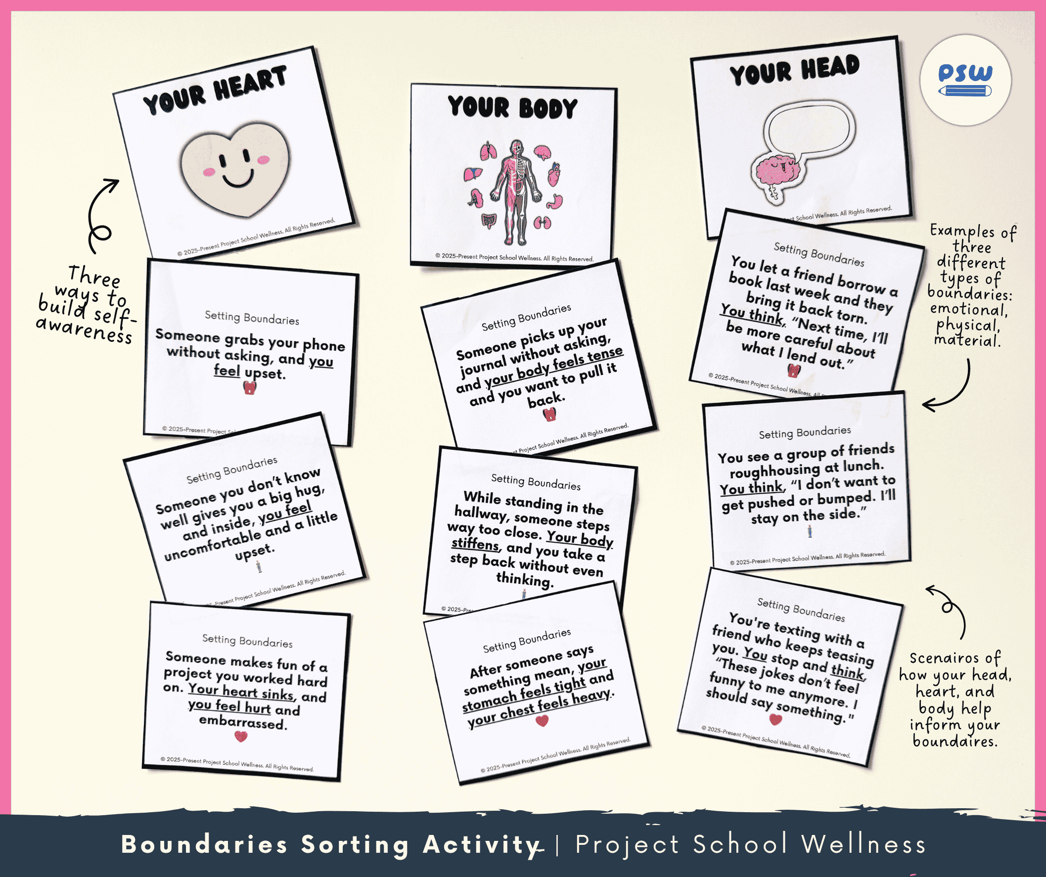 In this sorting activity, students sort different scenarios according to whether it’s their head, body, or heart signaling that something is wrong or right. Each scenario is also an example of different types of boundaries: